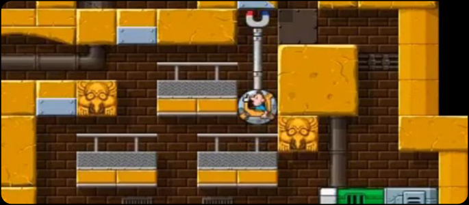 I could go on explaining all of the different gameplay traits you’ll run in to on your perilous adventure but I’d be writing for quite a long time. All you need to know is that by the last chapter, you’ll have a firm grasp of the methods and intricacies present in Archibald’s Adventures. In fact, possibly the most impressive thing about the game, especially considering it’s a mini, is the length. The game boasts 191 playable levels crammed into the meager 20Mb file size. What’s really laudable though is that it does this without ever succumbing to repetition. Every level presents you with a fresh challenge which you complete with your established skill set. Of course, the game also throws the odd curve ball; one of the chapters has you take control of the jetpack wielding professor who concocted these mechanical marvels.