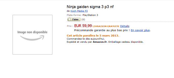 After both critical and commercial disappointment, it looks as though Team Ninja will be giving us another version next year in the form of Ninja Gaiden 3 Sigma. A listing from Amazon France has the game for both PS3 and Xbox 360, giving it a March 5th, 2013 release date.