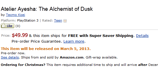 Following Amazon’s reveal of the Sniper Elite V2: Game of the Year Edition a little earlier today, they have also listed Atelier Ayesha: The Alchemist of Dusk for a March 5th, 2013 release at a $49.99 price.