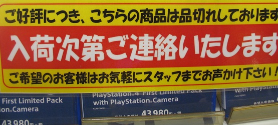 Today, Japanese game shops began selling the PlayStation 4. While you’ve probably seen lots of pictures of long lines and a big launch event, it turns out that there is plenty of stock still available to walk-ins. The above picture, for example, shows a “sold out” sign over the camera-bundled First Limited Pack, but there were still some consoles in this store. I arrived as the stores were opening, but found no one lined up to wait outside. (No stores anywhere in this area did midnight launches or special events; you had to wait for regular opening hours.) This may be a case of the internet seeing Tokyo as representing all of Japan. Such is not always accurate.
