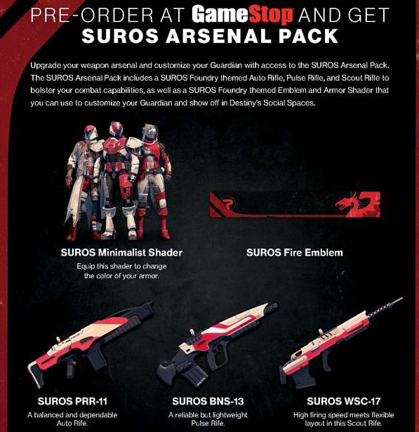 After it was leaked by retailers earlier today, Bungie confirmed that the Suros Arsenal Pack will be offered as a pre-order bonus for Destiny: The Taken King, regardless of which version you purchase.