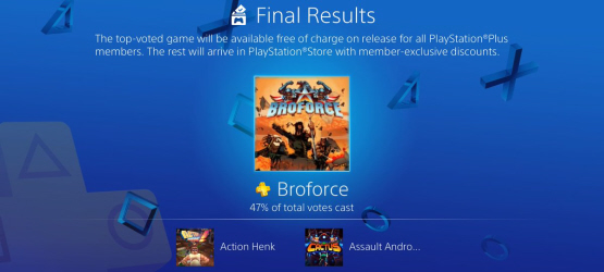 The Vote to Play polls are closed and we have a winner! Broforce joins PS Plus on 1st March. Thanks for voting! pic.twitter.com/JPtifi6IQl