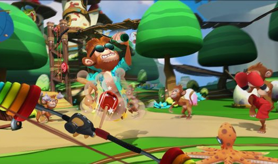 While some games are content with having players sit back and defend a single base, Ace Banana takes the shooter and sprinkles in a little tower defense. In the level I played for my hands-on session, you were in charge of defending bundles of bananas, which were stored at three separate bases. Making matters worse, these bases were vast distances away from each other. Luckily, all it takes is a single button press and momentary aiming mini-game to quickly slingshot around the map.