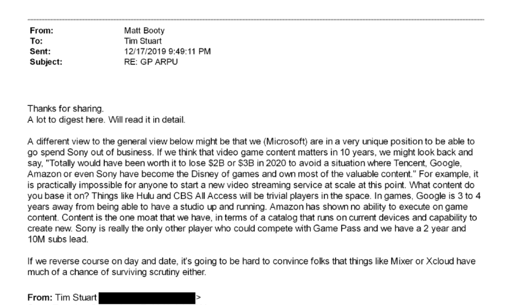 In December 2019, Booty replied to an email from CFO Tim Stuart, in which they appear to be discussing Game Pass and Xbox’s content strategy going forward. In the opening line of his email, Booty proposes a “different view to the general view” whereby Microsoft can simply “go spend Sony out of business.” Booty states the obvious: Microsoft has enough money to curb stomp competitors.