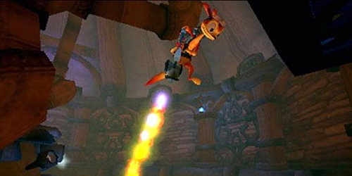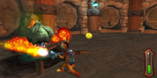 Daxter has the ability to swipe at enemies with his orange, furry tail. But the high-voltage bug swatter he’s handed at the beginning of the game is far more useful, and as the game progresses he learns a few extra acrobatic moves for this weapon. The next weapon he earns is a spray gun, which emits a toxic gas that damages enemies. The spray gun goes through two additional upgrades: fire, and shockwave energy. These are selectable through the D-pad, and are very fun to use. The spray gun, however, also doubles as a hover propellant, allowing Daxter to float over precipices to safety.