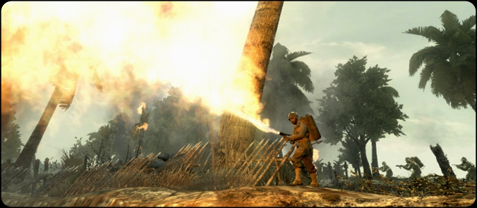 World at War focuses on battles in the Pacific that took place between the U.S. and Japan, as well as the Eastern Front, where Russia fought back and eventually overpowered Nazi Germany. The narrative swings back and forth between the viewpoints of Private Miller (U.S.) and Dimitri Petrenko (Russia), with a motion-graphic cinematic presented prior to each level. They are both informative and interesting to watch, as they include actual footage from these two conflicts. This was a wise choice on Treyarch’s part since the it adds both authenticity and cohesiveness to the single player campaign.