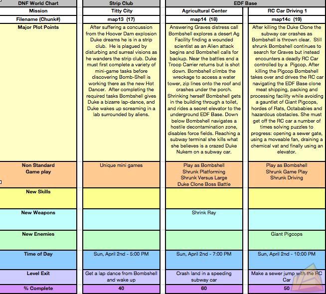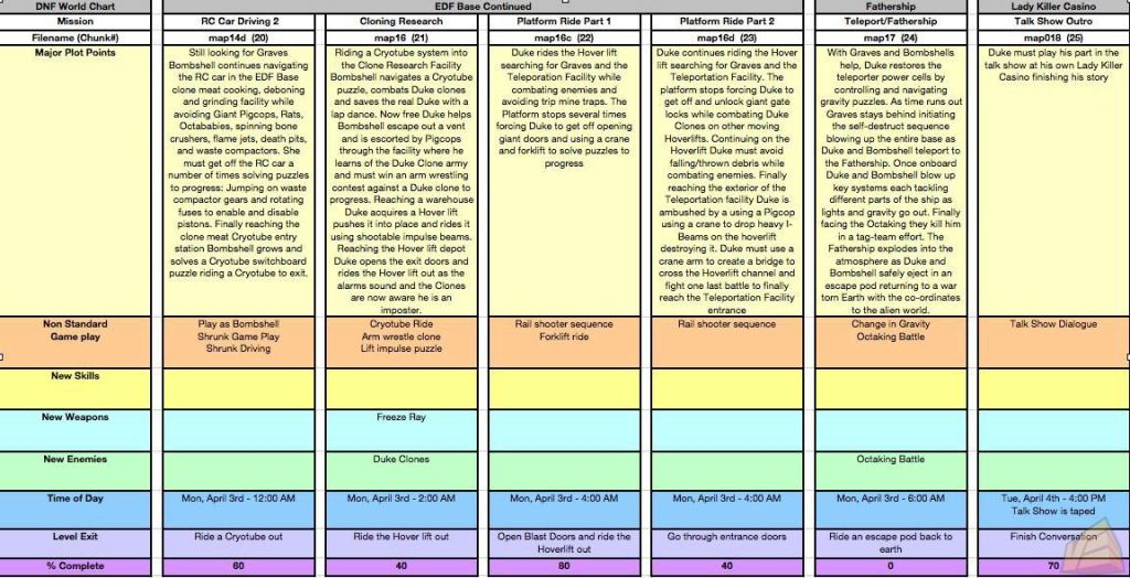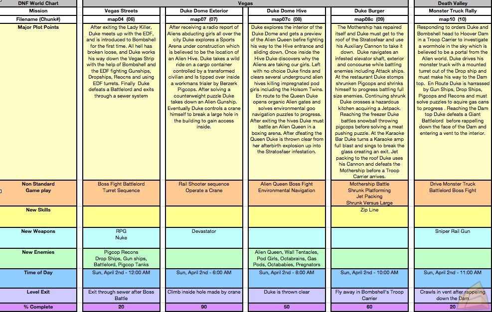 The massive Duke Nukem Forever leak continues with detailed outlines of the level structure and plot progression. These screens are a great example of how videogames are laid out and organized prior to development, and should benefit our aspiring videogame designers out there.