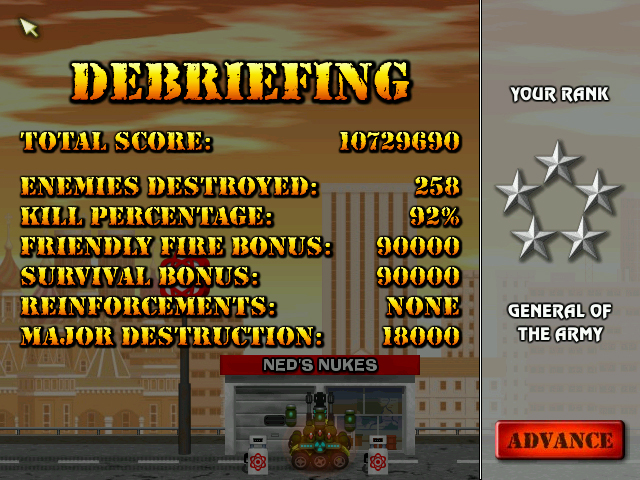 Heavy Weapon includes 19 exciting stages and challenging level bosses. Players launch their mission as an Atomic Tank, collect power-ups from friends and engage the enemy! Mission mode allows players to follow the storyline to the unlockable Boss Blitz mode where they can battle every boss in the game! The Survival mode features a nonstop onslaught of enemies to see which players can outlast the rest and achieve the best time!