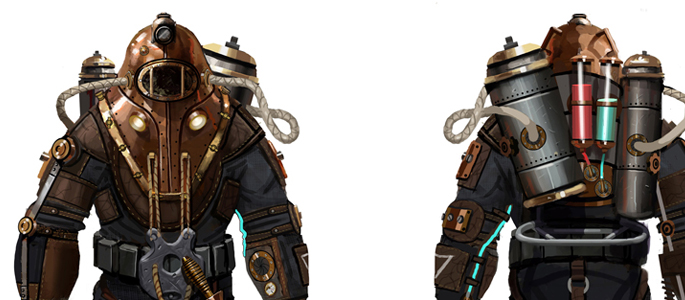 “Between the first BioShock and the sequel, you’ve seen a lot of concept art for Big Daddies. The logic behind this concept art went beyond different designs and suit combinations. The artists had to imagine what the very first Big Daddy would have on him — this Big Daddy had to feel like he was a rough draft or a work-in-progress, an amalgam of Big Daddies to come. The first Big Daddy was a test case, and in making the perfect prototype, 2K Marin drafted many, many prototypes themselves.”