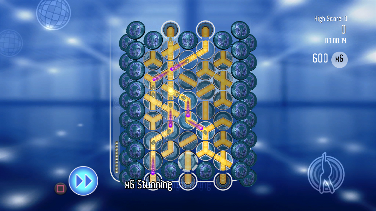Multipliers can be achieved by creating multiple paths on a single run, and these will be the biggest contributor to your overall score, as single paths won’t keep you in the game very long. As stated above, as you progress, the levels change along with the background image, theme, and music. In addition to this, the speed at which the Droplitz flow increases, and the game gets faster and faster, so you’ll quickly find yourself flying across the board trying to get these paths aligned as time runs out. You can also choose to fast forward the game if you already have a path set-up, which can save you precious seconds in the long run.