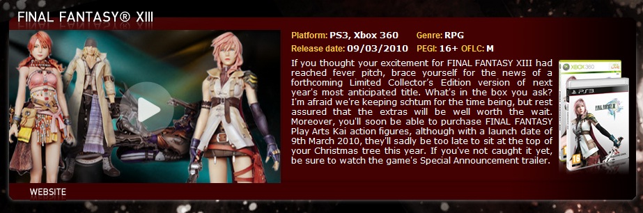 “If you thought your excitement for FINAL FANTASY XIII had reached fever pitch, brace yourself for the news of a forthcoming Limited Collector’s Edition version of next year’s most anticipated title. What’s in the box you ask? I’m afraid we’re keeping schtum for the time being, but rest assured that the extras will be well worth the wait.”