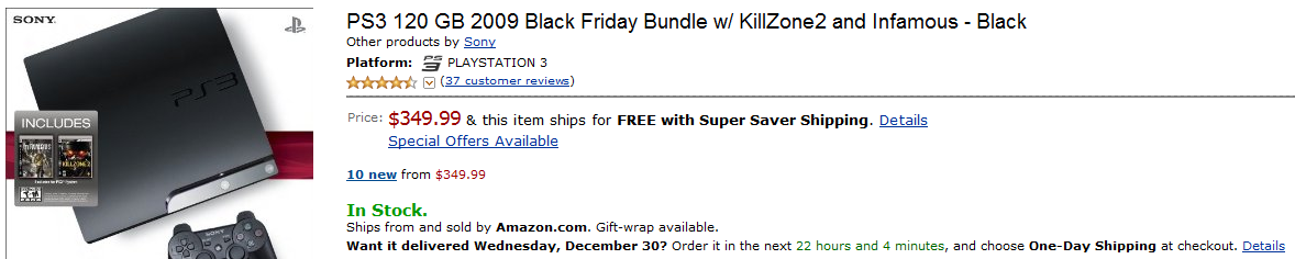 Strangely enough, some of these aforementioned Killzone 2 and inFamous 120GB PS3 slim bundles are indeed available right now on Amazon.com. Also, it ships and is sold from Amazon, not some third party retailer who hoarded these scolding hot bundles on Black Friday.