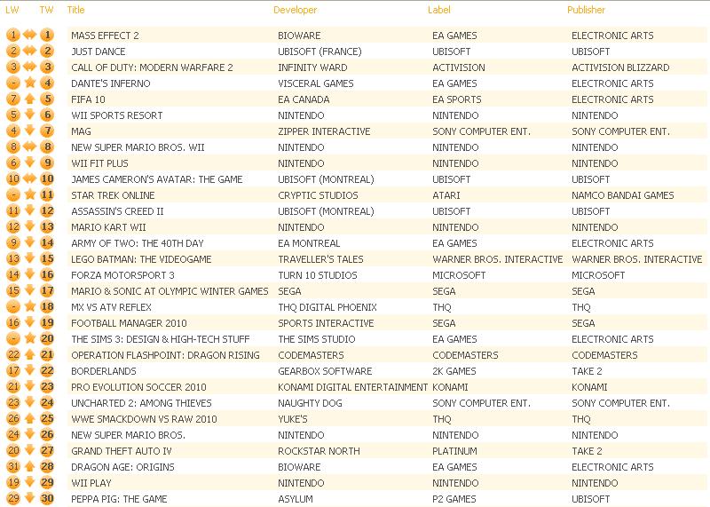 Last week saw Just Dance still holding off Modern Warfare 2 from top spot on the UK charts, with Mass Effect 2 zipping all the way to the top. This week, the release of Dante’s Inferno shows its impact on sales charts…