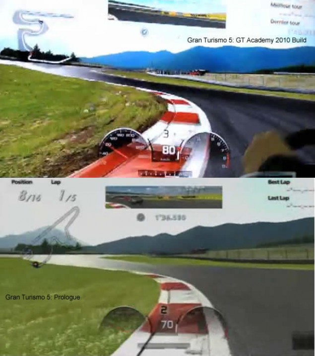 Looking at comparison shots of the same areas between Gran Turismo 5: Prologue and the latest GT Academy, we see that the development cycle saw a revamp in textures and re-envisioned realism to stray away from its “realer-than-real” visuals. Check it out in the shots below.