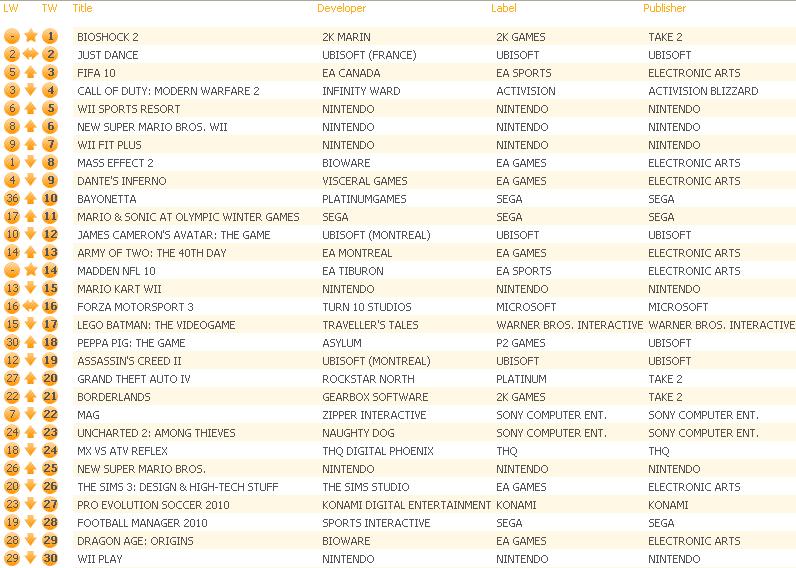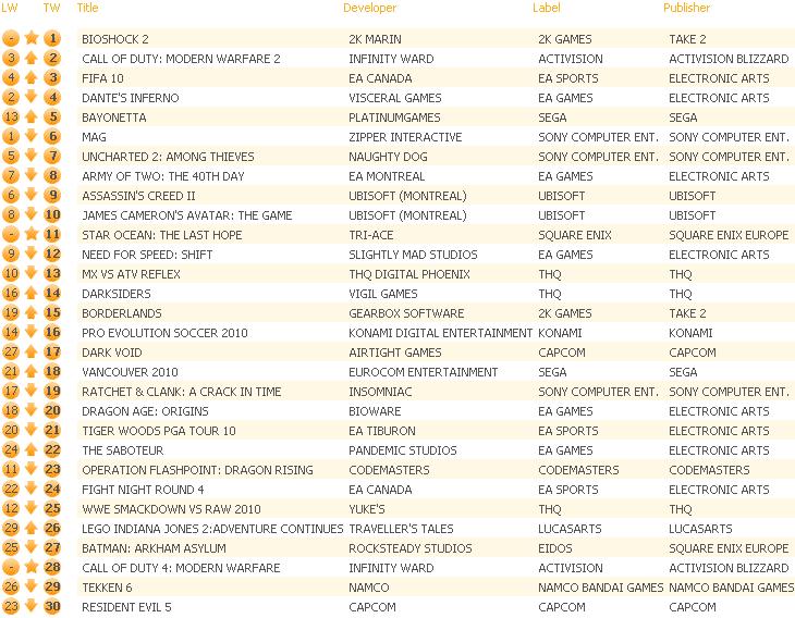 Last week saw Mass Effect 2 taking top spot, but this week, 2K Marin‘s sequel has gone all the way in its first week. Just Dance is still dancing on its second spot, while FIFA 10 makes a return to third. Bayonetta has also entered the top 10 again, which is probably due to its price cut to £17.99. Last week’s UK charts can be viewed here.