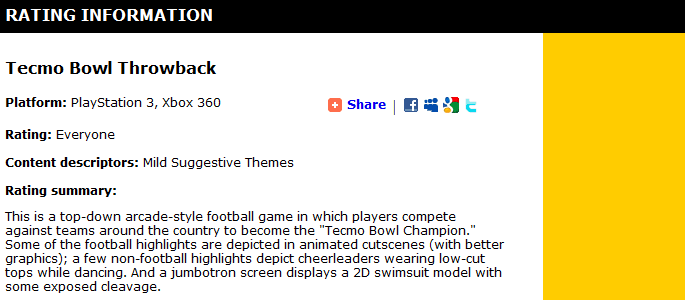 Tecmo Bowl Throwback has been rated by the ESRB. The title has been given an “E for Everyone” rating, and is described as “a top-down arcade-style football game in which players compete against teams around the country to become the ‘Tecmo Bowl Champion.'” No other information comes from the listing, but the game does “depict cheerleaders wearing low-cut tops while dancing,” as well as “a 2D swimsuit model with some exposed cleavage.” Oh, the horror. Check out the full listing below.