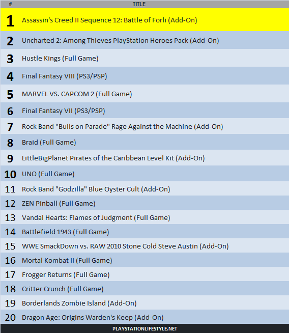 The PlayStation Store’s Top Downloads has been updated. This update features quite a few familiar faces in the top 20 with a mix of full games and add on content. For a full list of the top 20 please check it out below.