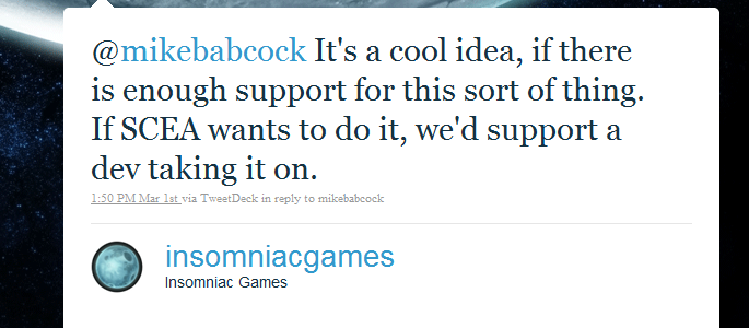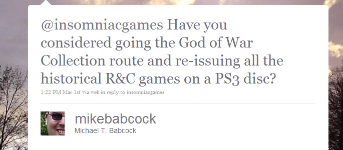 A follower of Insomniac asked the PS3 developer on Twitter if they were ever considering a collection, packing the four PS2 Ratchet & Clank titles on one Blu-Ray disc. Nicely enough, Insomniac responded.