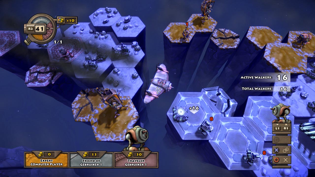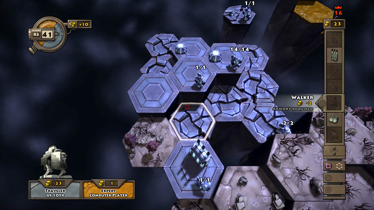 In addition to building harvesters, you can build armories, cannons, and airships. Armories can be built on any tile you have control of and are used to create walkers, the foot soldiers of the game. You use them to take over tiles and attack enemy tiles. Cannons can also be built on any tile you control. You buy ammo separately, and can fire on a tile up to 5 tiles away, which can reach halfway across most maps. Attacking an enemy tile with your cannon will cause the tile to lower a level, and destroy a tile if it is cracked. Airships are used for taking a group of walkers from one tile to another tile. These are essential, because in most matches there are gaps you will need to cross.