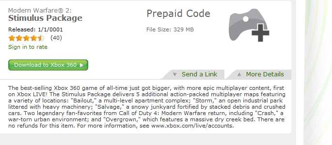 A listing on the Xbox LIVE Marketplace has prematurely revealed the maps for the “Stimulus Package”, the first DLC pack for Modern Warfare 2. The pack will feature five maps; three new maps, and two remade maps from Call of Duty 4: Modern Warfare.