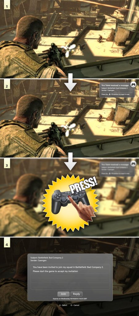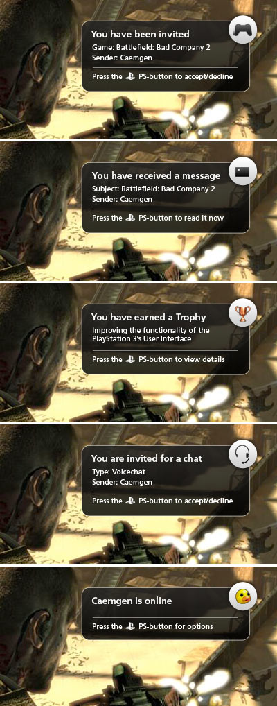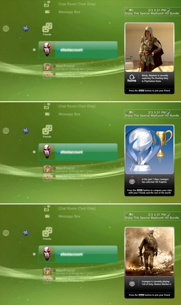 The PS3 invite system has been quite nitpicked since in-game XMB began. When a friend sends you an invite for a game, you’ll have to open the XMB, scroll to your message box, open the inbox, select the message, then accept the invite–a somewhat clunky process. PSN user Caemgen decided to take the Xbox 360 route on this one, offering a simpler way to accept invites. Another new feature he added to the concept was a new box beside your friend list. This new box gives the latest snapshot on their PlayStation Home avatar, and trophies earned in the past week.