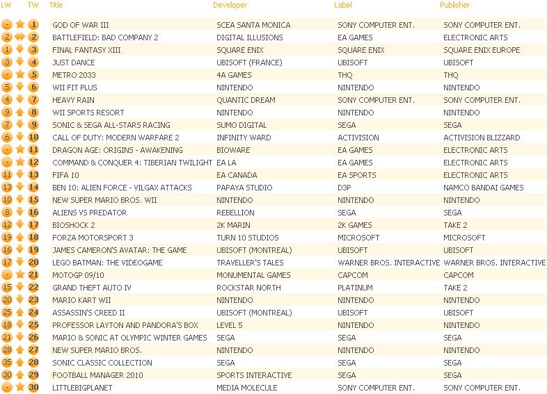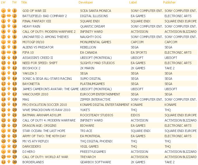 During 2009, Sony only had one game which reached the coveted 1st position with Killzone 2. However, Heavy Rain and now God of War III has already made it two straight number ones in the charts for 2010.