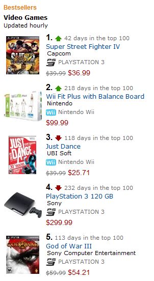 Not to be outdone by WalMart.com, Amazon.com is offering SSFIV at $36.99, which is $3 bucks off the overall price, they’re also throwing in $10 towards another video game purchase PLUS the ‘Super Classic costume’ DLC pack for free, which has resulted in SSFIV taking over the overall spot in Amazon’s video games bestsellers list! Need some proof? Check out the image below: