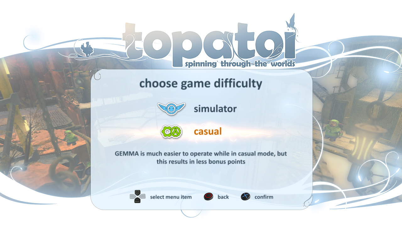 Boolat Games is glad to introduce a new easy mode to the published earlier PS3/PSN exclusive platform/adventure Topatoi. This new difficulty mode is now available to all Topatoi’s owners on the US, EU and Asia as a free patch. Therefore, the latest version of Topatoi has two difficulty modes available – casual and simulator. The casual mode’s been set by default.