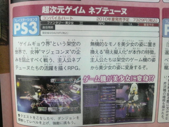 Think you’ve heard of every video game plot there is? Think again – the folks over at development/publishing house Compile Heart have come up with a novel idea for an RPG – play on your console as a console. More details on this as well as some magazine scans after the jump.