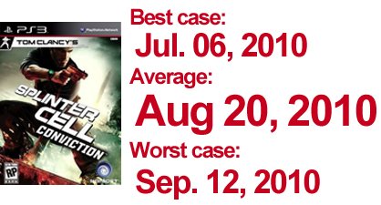 Due to the history of timed-exclusive titles for PS3, and the fact that Splinter Cell has never not been released for a PlayStation platform, GamesRadar has taken it upon themselves to guess when Conviction will hit for PS3. Using Xbox release dates of previous Splinter Cell titles, and combining them with the later release of the PS2 version, the gaming website has seemingly predicted when Splinter Cell: Conviction will arrive for PlayStation 3.