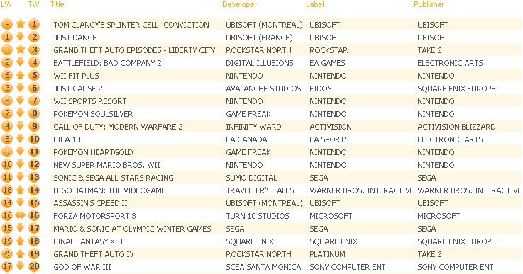 Splinter Cell: Conviction has taken top spot in the latest UK charts. The once Xbox 360 exclusive DLC, Grand Theft Auto: Episodes from Liberty City, has entered the charts at a respectable 3rd position. Battlefield: Bad Company 2 drops down to fourth while Just Cause 2 falls down to 6th. Last week’s charts can be viewed here.