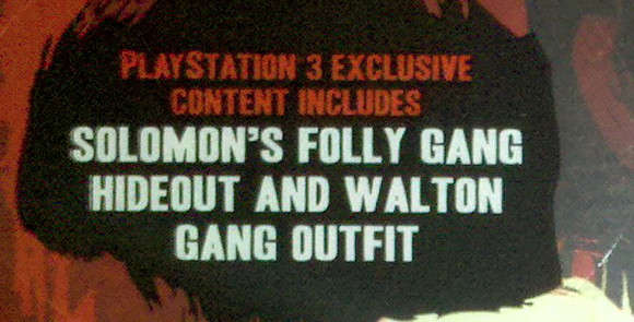 The PlayStation 3 version of Red Dead Redemption will include exclusive content for players. The content is titled “Solomon’s Folly Gang Hideout and Walton Gang Outfit” and a code is included within the game’s case.