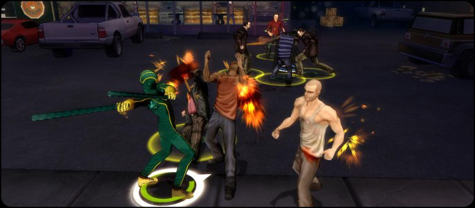 Like any classic beat-em-up, Kick-Ass does not have a narrative strong enough to serve as an incentive to play until the end. Players basically climb a hierarchy of villains featured in the feature-film and face them one-by-one. The game refreshes players’ memories with a mix of live-action cutscenes from the movie and real-time gameplay with voice-overs pulls from the film’s dialogue. The end result is an almost laughable experience leading into the actual gameplay.