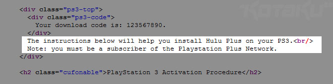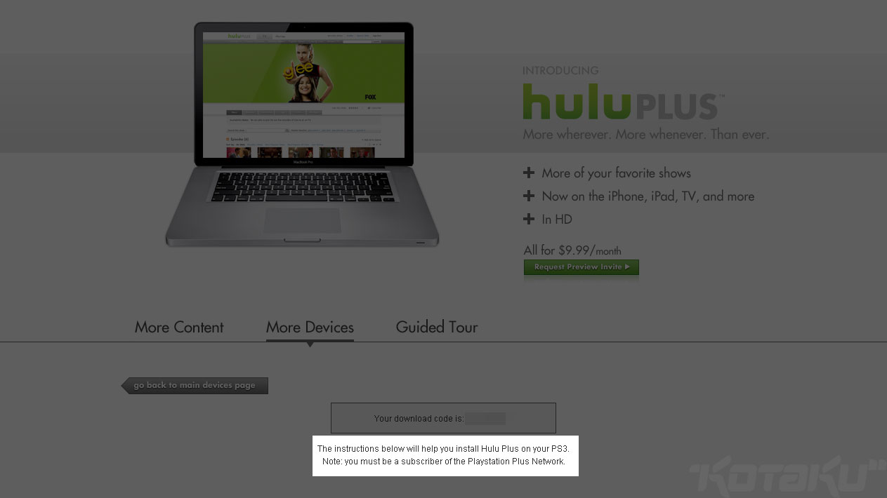 The above is not stated on the actual devices page, however, a reader sent an image to Kotaku of getting a preview code for Hulu Plus which shows PlayStation Plus is indeed needed for the service.