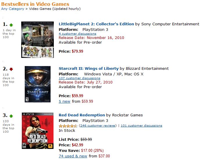 What really makes this such a feat, isn’t just the fact the LittleBigPlanet 2 Collector’s Edition reached the top of the list within 24 hours, but because it’s beating out the incredibly anticipated StarCraft II for the PC, which releases in just days, and Red Dead Redemption for the PS3, which just so happens to be Amazon’s Deal of the Day and is selling for the low, low price of $43.