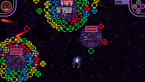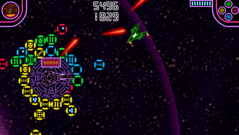 Much like Star Castle or Yar’s Revenge, the goal is to destroy an enemy surrounded by multiple rings of protection. In the case of Stellar Attack, these rings are made up of color-coded orbs. Some of these orbs have special logos over them, which do varying actions when hit by the properly-colored laser from your ship. This can vary from speeding up the rotation of the orb rings to firing extra shots at your ship. The control scheme also follows that of retro games – rather than pointing the analog stick in the direction that you wish to move, you can only rotate left or right and thrust forward. The L and R buttons do add some side thrust controls to the ships, which helps, but it is definitely something to get used to if you do not play older arcade titles regularly.
