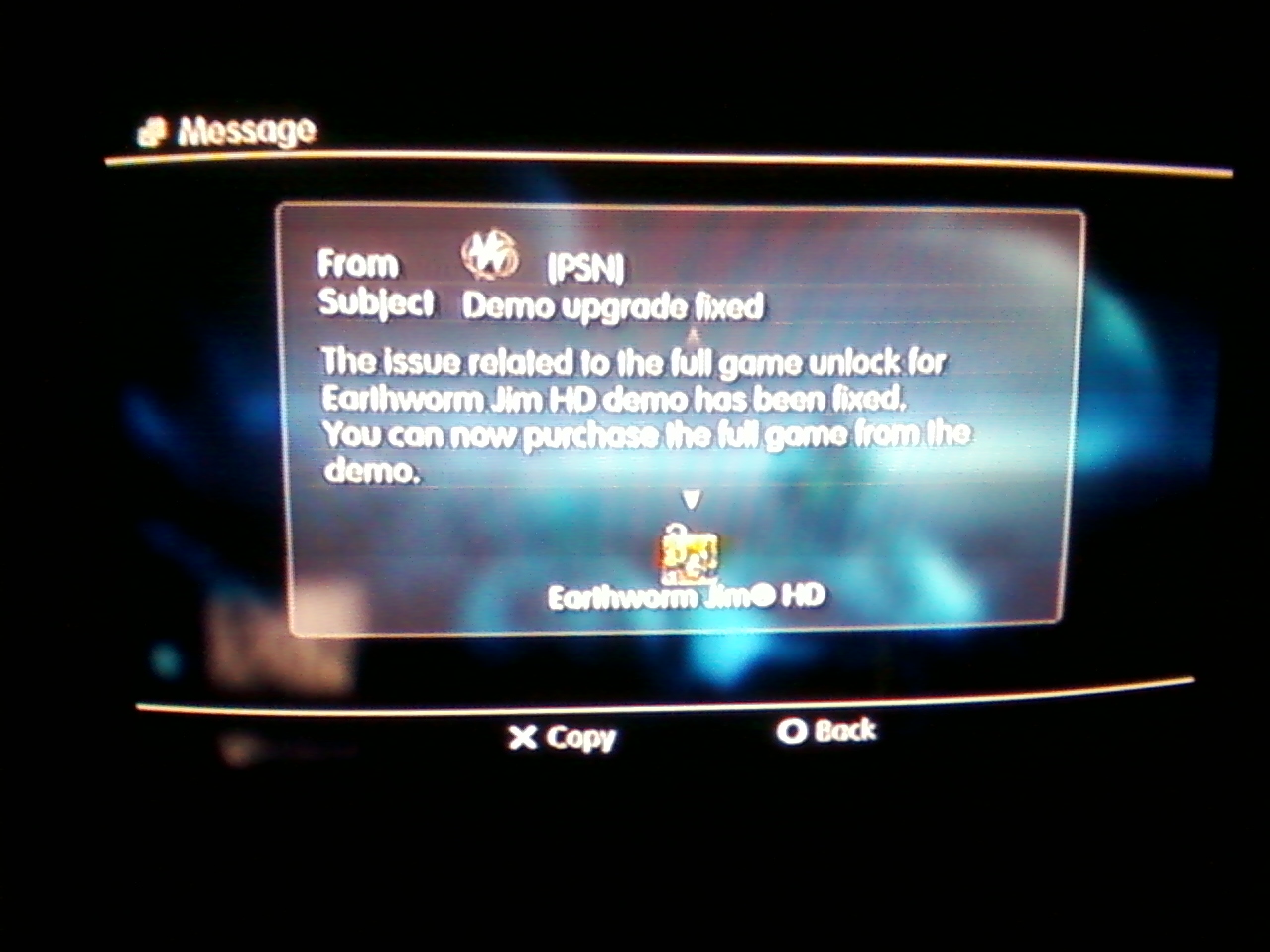 While relaxing early this morning, I found myself cruising around the XMB when I received a message regarding the Earthworm Jim HD full-game unlock from a user with the PSN id: [PSN]. Turns out this wasn’t an actual user, but apparently a new method Sony has implemented to communicate with the PlayStation Network at large. Do we have a hidden, new firmware addition on our hands? It appears so.