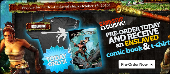 On Gamestop’s online website, gamers will have the opportunity to gain additional bonuses for pre-ordering Enslaved through their online retailer. In addition to their previous bonus, they’ll be throwing you a Monkey T-Shirt and a comic book to boot that will give you additional insight to the back story behind Monkey and Trip’s adventure. This deal is only good for today and no other. Hop on over to Gamestop and get your pre-order swag guaranteed today!