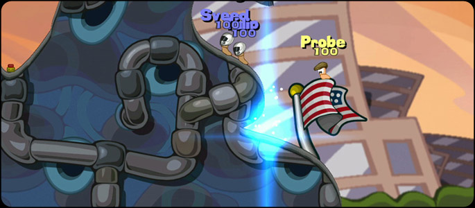 The team building twiddly knobs from the previous game are back and in full force in Worms 2, but now you can customize your wriggling squad even further. This game comes with a hefty batch of replaceable heads for your Worms to parade around in: there are the usual mix of cultural hats to choose from including sombrero, pirate hats and the like but there are also some more noticeably iconic character features like Sackboy and Helghast helmets. What better way to pledge franchise allegiance than to have your army don the caps of your treasured characters. There’s also a bevy of new skins, gravestones and hilariously adorable death animations to have a look through.