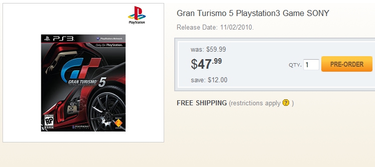 Newegg is currently offering Gran Turismo 5 for pre-order at a price point of only $47.99. The pre-order also includes free shipping, and it’s worth mentioning that Newegg does a fantastic job of shipping quickly. Don’t sit around thinking about it, pre-order GT5 before this deal is out!