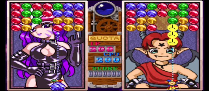 Magical Drop F‘s gameplay is reminiscent of Bust a Move and has had a huge influence on current favorites like Critter Crunch. Shooting from the bottom to the top of the screen, players have to match groups of colors and create unbelievable stacking combos to rack up more points against the opponent. It’s pure competitive puzzling at it’s finest. Fast-paced and frantic gameplay that will have you on the edge of your seat. At the beginning of each match, three special weapons can be chosen and activated at will that can change the entire outcome of the match. There are too many weapons to describe here and it wouldn’t be possible anyway – too much Japanese.