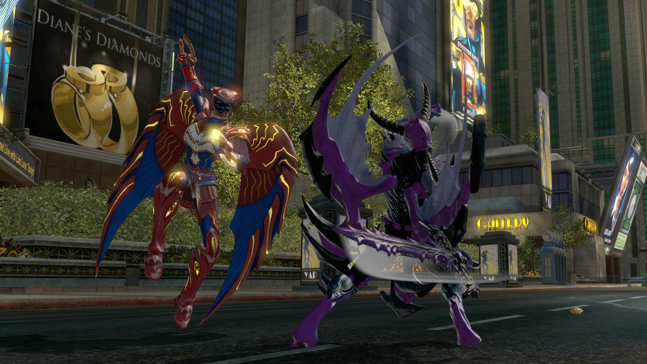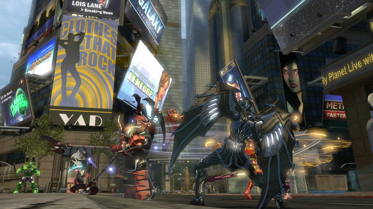 The other images reveal one of the key areas in Metropolis: Glen Morgan Square. The landscape consists of tall immense buildings, advertisements for Daily Planet Live: Starring Lois Lane, and billboards of Booster Gold himself. Players fighting in the streets of Glen Morgan Square are desirous of becoming the next legend look and feel a part of the DC Universe in these exclusive screens. Created players look extremely detailed and the environments look complete and polished.