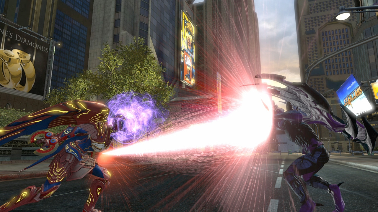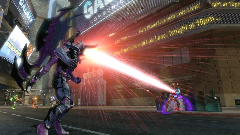 The other images reveal one of the key areas in Metropolis: Glen Morgan Square. The landscape consists of tall immense buildings, advertisements for Daily Planet Live: Starring Lois Lane, and billboards of Booster Gold himself. Players fighting in the streets of Glen Morgan Square are desirous of becoming the next legend look and feel a part of the DC Universe in these exclusive screens. Created players look extremely detailed and the environments look complete and polished.