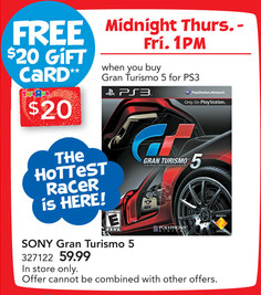 For those wanting to pick up GT5 and get even more bang for your buck, all you have to do is head over to a Toys R’ Us near you, pick up your copy before 1PM on Black Friday and they will throw a $20 gift card your way for FREE. Well what are you waiting for, get dressed and get ready to storm over to the store nearest you and pick up your copy; though, you should have already done so Wednesday.