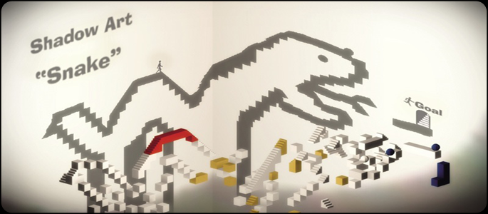 “Echo” mode is just like the original echochrome where you must use your shadow to collect various echos across the stage. “Paint” mode is where echochrome ii begins to innovate, rather than merely redesign the former game. In this mode, there is no official “exit” to the stage. Using three new colored characters, you are required to traverse the shadows to color their corresponding blocks. The level is only finished after a certain percentage of the blocks are painted, leaving the path to completion completely up to the player. One of the major attractions to echochrome ii is also moving the light source around and discovering the pieces of Shadow Art within the different stages. I’ve only come across a few of the art pieces so far in the game, sometimes two in each stage, so I don’t know if there is some in every level. Sometimes the game can really get frustrating so it’s definitely suited for small doses. A fresh view a day, or even just a few hours later can really change the perspective on a level.