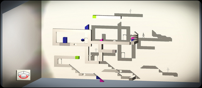 The real meat of echochrome ii comes from the level variety. Not only does the title have one hundred developer-created levels, but along with the nearly limitless amount of user-generated levels, each stage can be played in three different ways. “Escort” mode is the mode available on the PlayStation Network or PlayStation Move Starter disc and is what you are more familiar with. By casting the shadows over the environment, you move the character across the room to the exit, possibly one of a few. Exits are created by placing the shadow of a sphere on top of two cube shadows, creating an arching doorway. Depending on the angle of the flashlight, the design of the level, and the player’s own intuition, there can be several different exits in a stage.
