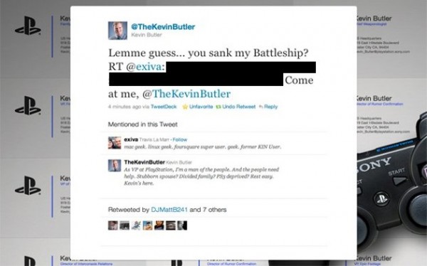 Kevin Butler is awesome. We all know it. After the price-drop of the PlayStation 3 a year and a half ago and the new face added to the campaign, things have been going great. His Twitter personality has been even more astounding it seems with the kinds of hilarious one-liners and witty quips that he comes up with on a daily basis. Unfortunately someone seems to have gotten the best of whoever runs that account last night. Last night Twitter user @exiva (Travis La Marr) taunted KB with by tweeting him the PS3 Security Key. Whoever was replied as KB’s account last night apparently didn’t understand what the code and actually retweeted the code. Don’t believe it? Here’s a screenshot, censored of course.