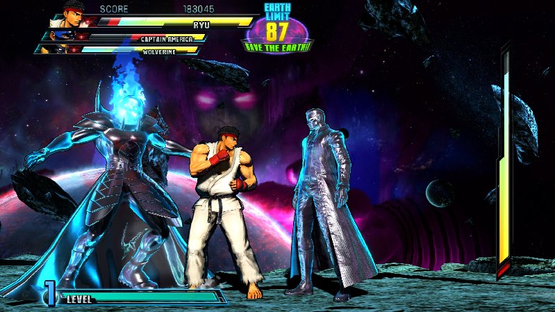Galactus has long been an imposing figure in the Marvel Universe and he fits well as the antagonist in  the tagline “Save the Earth“.  Akuma, Ryu and Wolverine pale in comparison to the sheer size of “The Devourer’s” upper torso in the latest high-res screens. A well executed combo by Ryu hits Galactus, but it doesn’t appear to phase him. And when Galactus take’s out what looks to be Steve Rogers—aka Captain America—You can’t even see him under his huge hands.