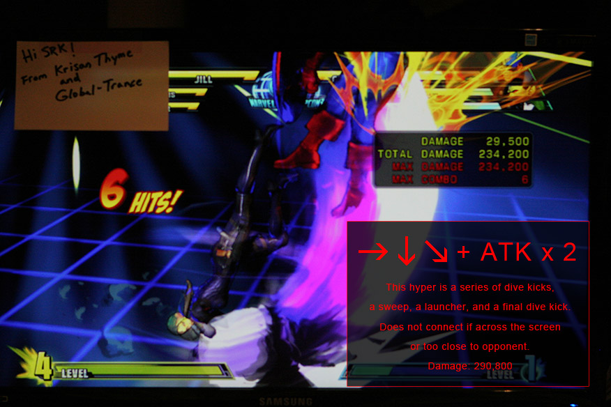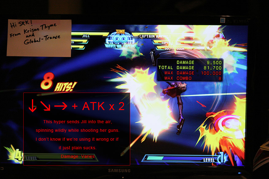 Furthermore her assists are suspiciously quiet.. there’s no ending taunt to them at all, barely even an audible grunt to them actually. In fact, a lot of her voice work is notably low-volume.. Her winning battle taunt is almost indecipherable, she mutters it so softly. Jill also appears to be missing any form of victory blurb at the end of battle.. Likewise, although her moveset is complete (as mentioned above) there do appear to be what I’d call balancing issues.. Her Machine Gun Hyper is a good example.. It’s honestly just so horrifically terrible, that I have a hard time believing it’s finished. If it’s honestly done the way it is, then she’ll probably have one of the worst hypers in the game in her arsenal. (Which isn’t too flattering to say for a DLC character, is it?)
