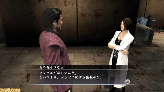 Famitsu has revealed another character to appear in Sega’s upcoming zombie-slaying PlayStation 3 title Ryu Ga Gotoku: Of the End, (the Ryu Ga Gotoku series being called “Yakuza” in the West). Takeshi Tanigawa is a researcher studying zombies, and given that Tokyo looks to be overrun with them in this game, the job seems timely.  Below, she’s the lady in the lab coat.